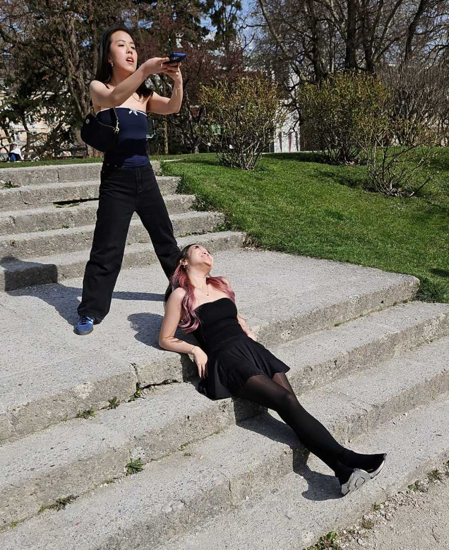 Asiatische Influencerinnen genießen die wärmenden Sonnenstrahlen im Mirabellgarten Salzburg.